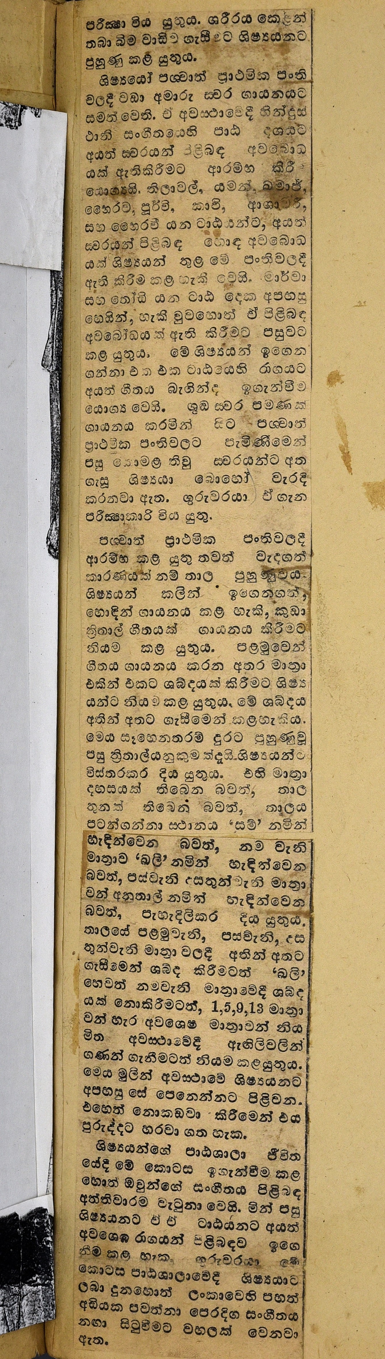 ශිෂ්‍යයන්ගේ පාඨශාලා ජිවිත යේදී මේ කොටස ඉගැන්වීම කළ හොත් ඔවුන්ගේ සංගීතය පිළිබඳ අත්තිවාරම මැටුනා වෙයි. මින් පසු ශිෂ්‍යයනට ඒ ඒ ටාඪයනට අයත් අවශෙෂ රාගයන් පිළිබඳව ඉගෙනීම කළ හැක. ගුරුවරයා මේ කොටස පාඨශාලාවෙදී ශිෂ්‍යයාට ලබා දුනහොත් ලංකාවෙහි පහන් අඩියක පවත්නා පෙරදිග සංගීතය නඟා සිටුවීමට වහලක් වෙනවා ඇත.