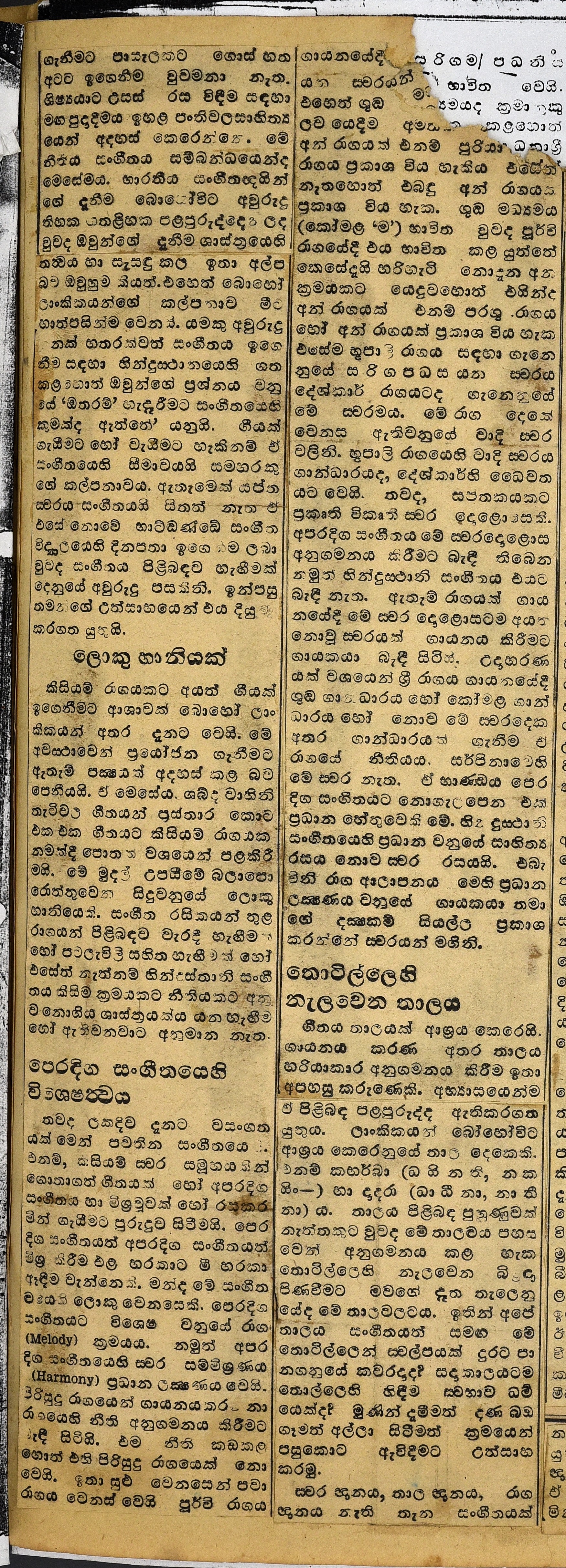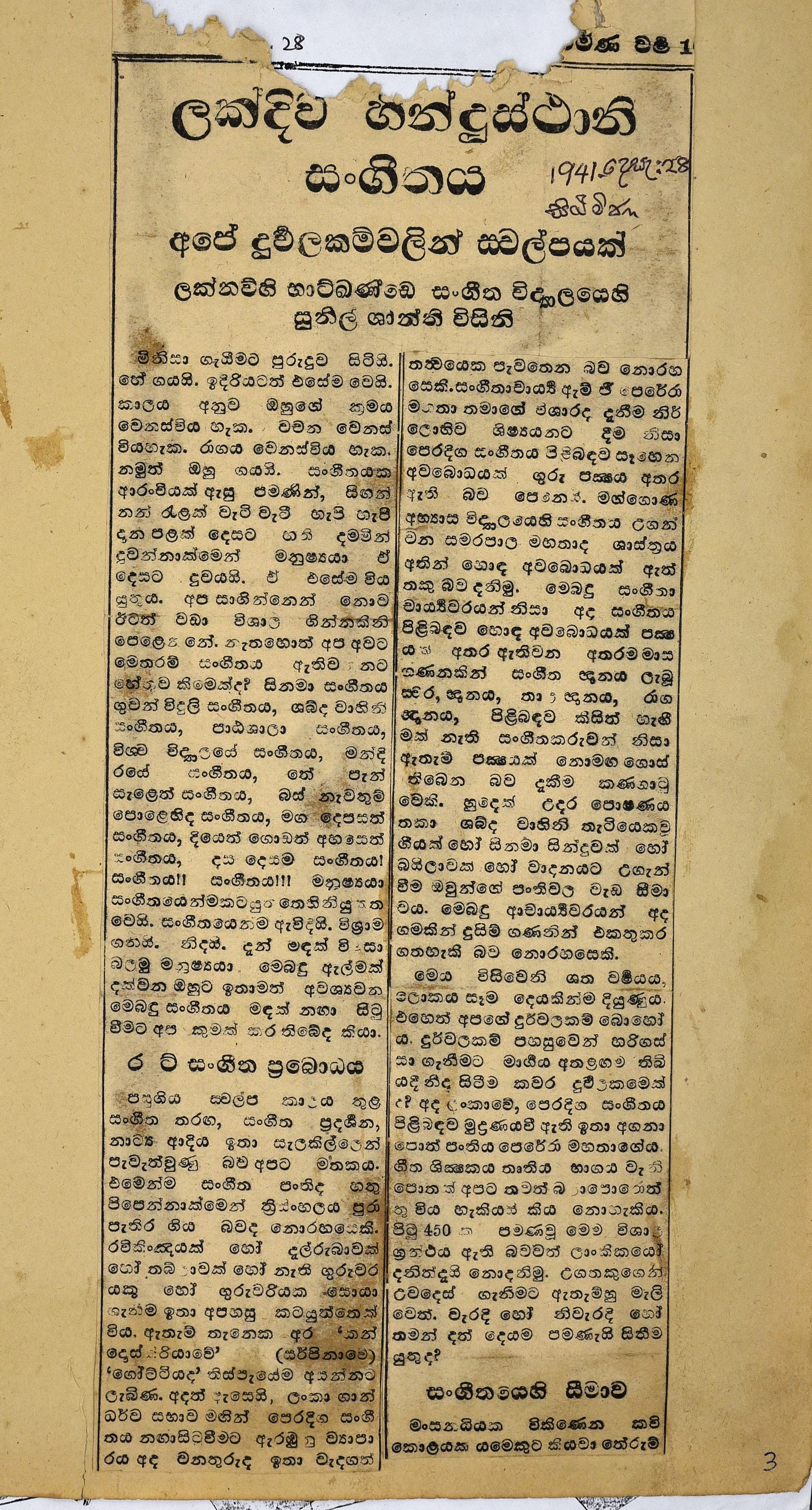 කලාකාරයා මුළු දිවා රෑ වෙහෙස නොබලා පැබැදුම් කරන ගී තවත් කොටසක් තම පොත්වල දමාගෙන පොත් ජාවාරම ගෙන යත්. මෙන්න මොවුහු වෙත් පෑල දොරින් පැමිණ කලාකරුවාට පිහියෙන් අනින්නෝ. එබඳු අයගෙන් අපි දයාබර ඉල්ලීමක් කරමු. දන බඩ ගා ඇවිදින බොළඳ සංගීත බිළිඳා ගේ අත් පා නොකඩන ලෙස. දැන් අපටමැ උරුම වූ දේශීය සංගීතයක් උවමනා බව අපි පිළිගනිමු. එසේ දැන දැනත් විදේශීන් ගේ සංගීතයට පොහොර දමා ඔවුන් ගේ සංගීතය වඩන්නට ගියොත් අපගේ කාරිය ඉටු නොවෙයි.