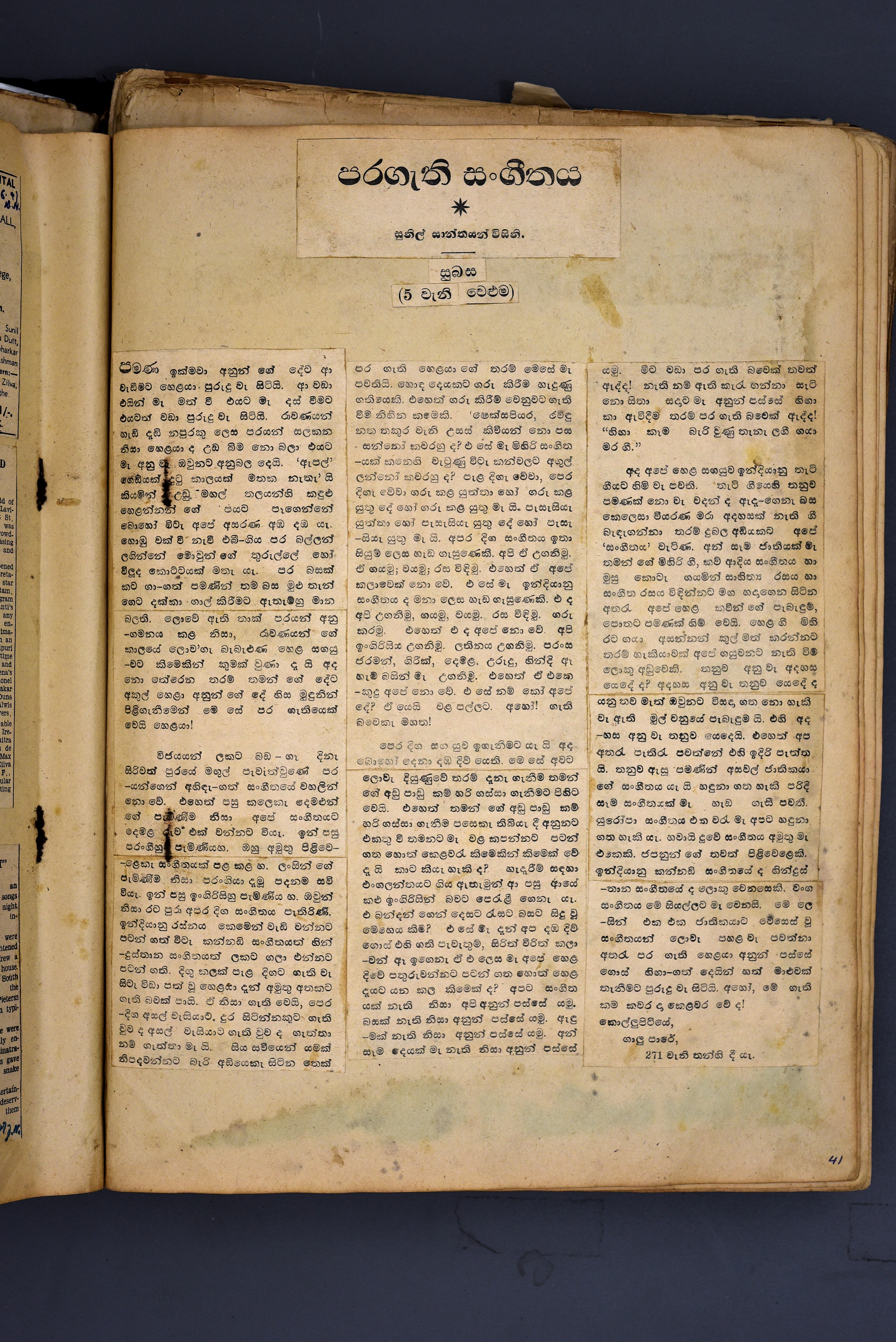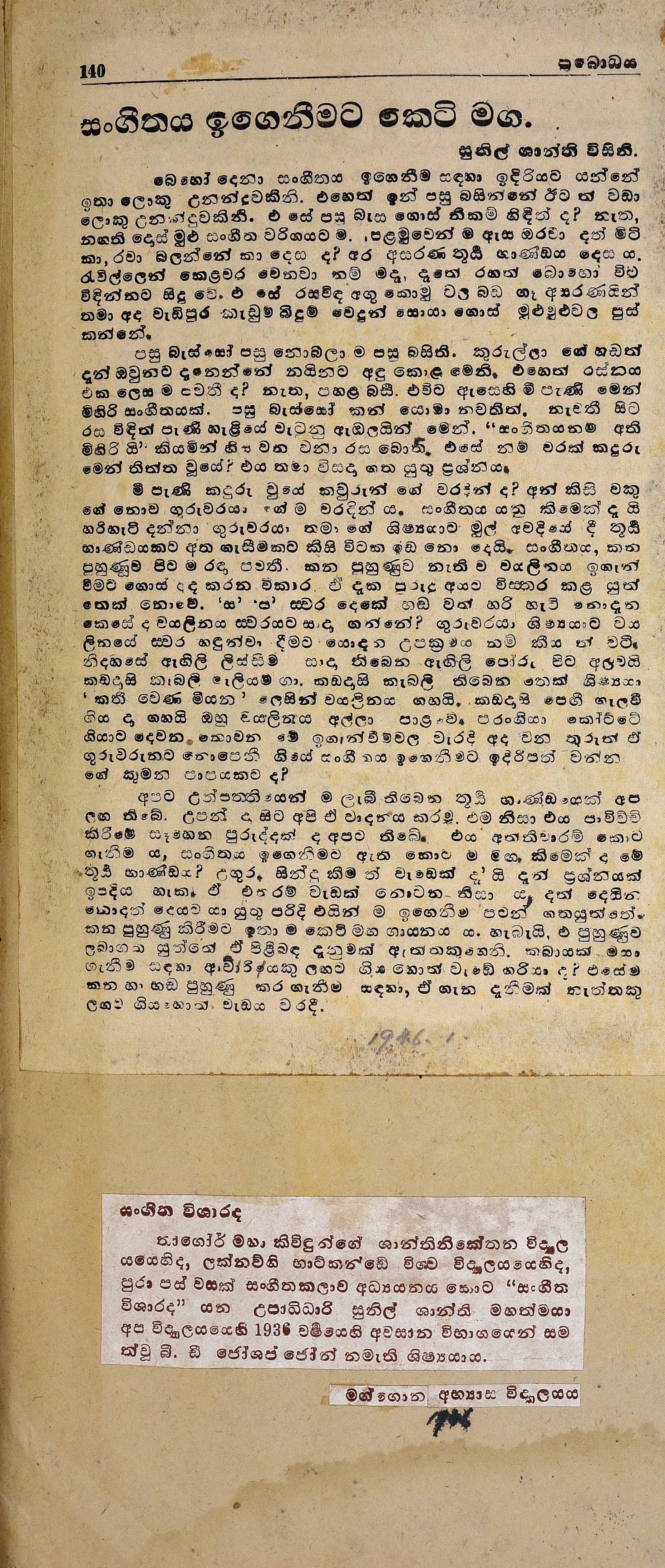 විජයයන් ලකට බඩ-ගෑ දිනැ සිරිවත් පුරයේ මඟුල් පැවත්ත්වුණේ පරයන්ගෙන් අහිඳැ-ගත් සංගීතයේ වහලින් නොවේ. එහෙත් පසු කලෙකැ දෙමළුන් ගේ පැමිණීම නිසා අපේ සංගීතයට දෙමළ රුව එක් වන්නට වියැ. ඉන් පසු පරංගීහු පැමිණියහ. ඔහු අමුතු පිළිවෙළෙකැ සංගීතයක් පළ කළහ. ලංසින් ගේ පැමිණීම නිසා පරංගියා දැමූ පදනම සවි වියැ. ඉන් පසු ඉංගිරිසිහු පැමිණිය හ. ඔවුන් නිසා රට පුරා අපර දිග සංගීතය පැතිරිණි. ඉන්දියානු රස්නය කෙමෙන් වැඩි වන්නට පටන් ගත් විටැ කන්නඩි සංගීතයන් හින්දුස්තාන සංගීතයත් ලකට ගලා එන්නට පටන් ගති. දිගු කලක් පැළ දිගට ගැති වැ සිටැ විඩා පත් වූ හෙළසා දැන් අමුතු අතකට ගැති බවක් පායි. ඒ නිසා ගැති වෙයි, පෙරදිග අසල් වැසියාට. දුර සිටින්නකුට ගැති වුවද අසල් වැසියාට ගැති වුවද ගැත්තා නම් ගැත්තා මැ යි. සිය සවියෙන් යමක් නිපදවන්නට බැරි අඩියෙකැ සිටින තෙක් පර ගැති හෙළයාගේ තරම් මෙසේ මැ පවතියි. හොඳ දෙයකට ගරු කිරීම හැදුණු ගතියෙකි. එහෙත් ගරු කිරීම් වෙනුවට ගැති වීම නිහීන කමෙකි. 'ෂෙක් සපියර, රවිඳු නත තකුර වැනි උසස් කිවියන් නො පසසන්නෝ කවරහු ද? එ සේ මැ මිහිරි සංගීතයක් කනෙහි වැටුණු විටැ කන්වලට අගුල් ලන්නෝ කවරහු ද පැළ දිගැ වේවා, පෙරදිගැ වේවා ගරු කළ යුත්තා හෝ ගරු කළ යුතු දේ හෝ ගරු කළ යුතු මැයි. පැසැසියැ යුත්තා හෝ පැසැසියැ යුතු දේ හෝ පැසැසියැ යුතු මැයි. අපරදිග සංගීතය ඉතා සියුම් ලෙස හැඩ ගැසුණෙකි. අපි ඒ උගනිමු. ඒ ගයමු; වයමු; රස විඳිමු. එහෙත් ඒ අපේ කලාවෙක් නොවේ. එසේ මැ ඉන්දියානු සංගීතය ද මනා ලෙස හැඩ ගැසුණෙකි. එ ද අපි උගනිමු, ගයමු, වයමු. රස විඳිමු. ගරු කරමු. එහෙත් එ ද අපේ නොවේ. අපි ඉංගිරිසිය උගනිමු. ලතිනය උගනිමු. පරංස ජරමන්, ගිරීක්, දෙමළ, උරුදු, හින්දි ඈ හැම බසින් මැ උගනිමු. එහෙත් ඒ එකෙකුදු අපේ නොවේ. එසේ නම් කෝ අපේ දේ? ඒ යෙයි වළ පල්ලට. අහෝ! ගැති බවෙකැ මහත!