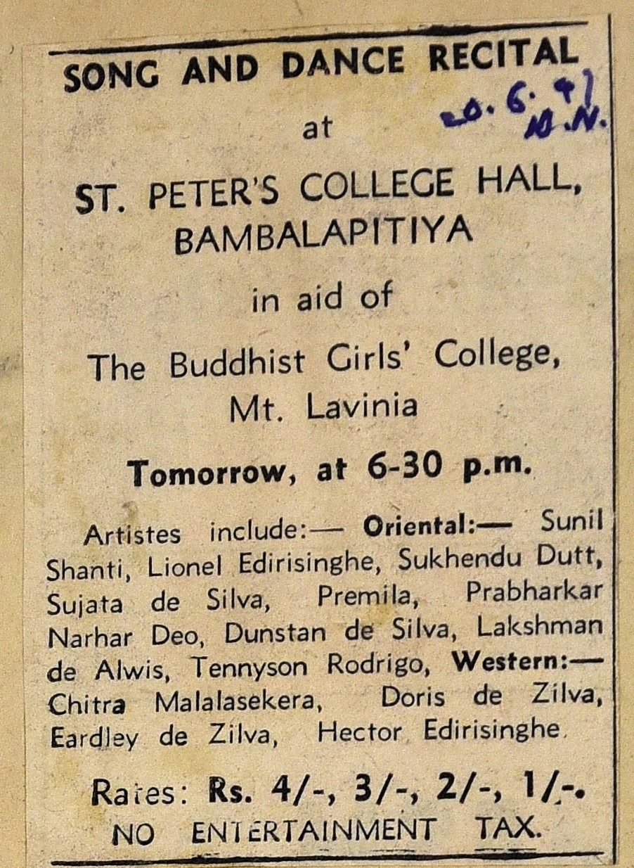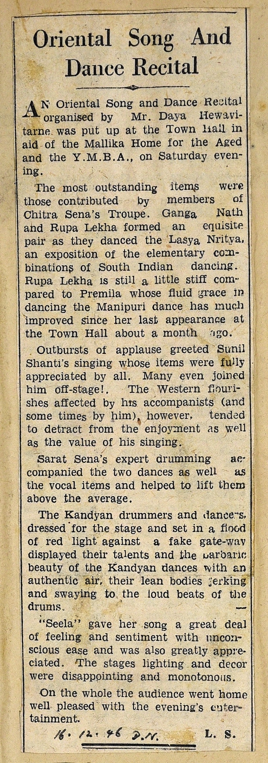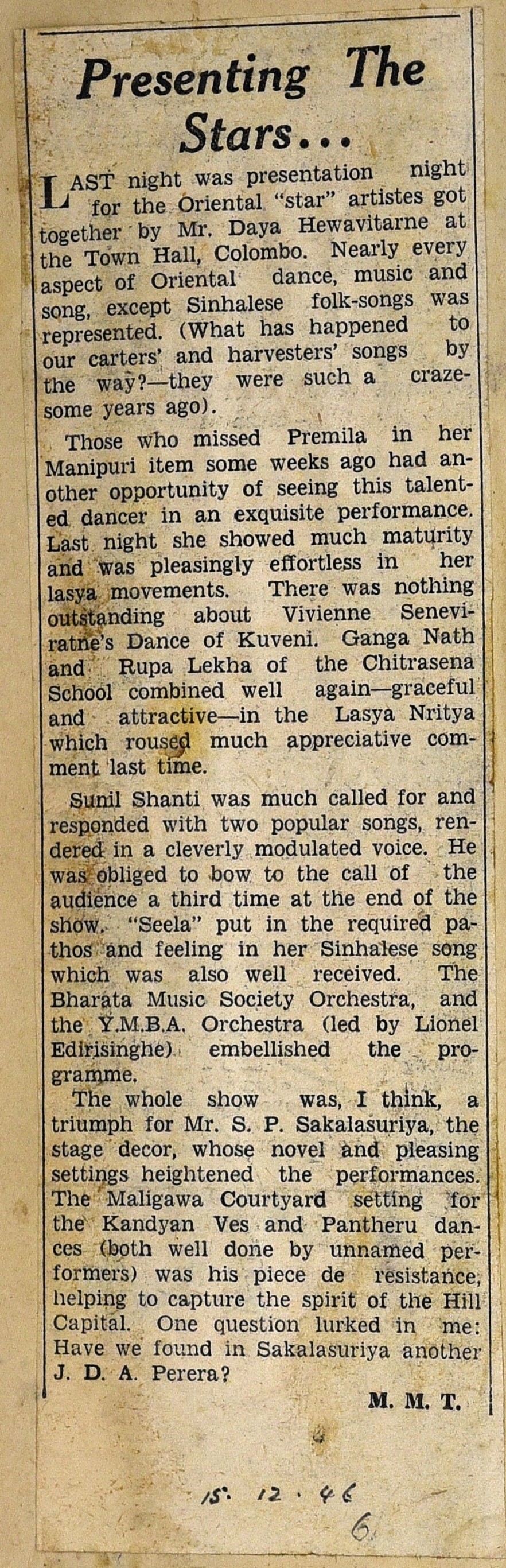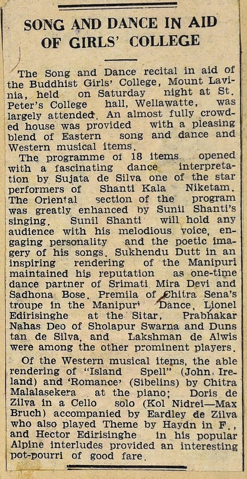 The programme of 18 items. opened with a fascinating dance interpretation by Sujata de Silva one of the star performers of Shanti Kala Niketam. The Oriental section of the program was greatly enhanced by Sunil Shanti's singing. Sunil Shanti will hold any audience with his melodious voice, engaging personality and the poetic imagery of his songs. Sukhendu Dutt in an inspiring rendering of the Manipuri maintained his reputation as one-time dance partner of Srimati Mira Devi and Sadhona Bose. Premila of Chitra Sena's troupe in the Manipuri Dance, Lionel Edirisinghe at the Sitar, Prabhakar Nahas Deo of Sholapur Swarna and Dunstan de Silva, and Lakshman de Alwis were among the other prominent players.