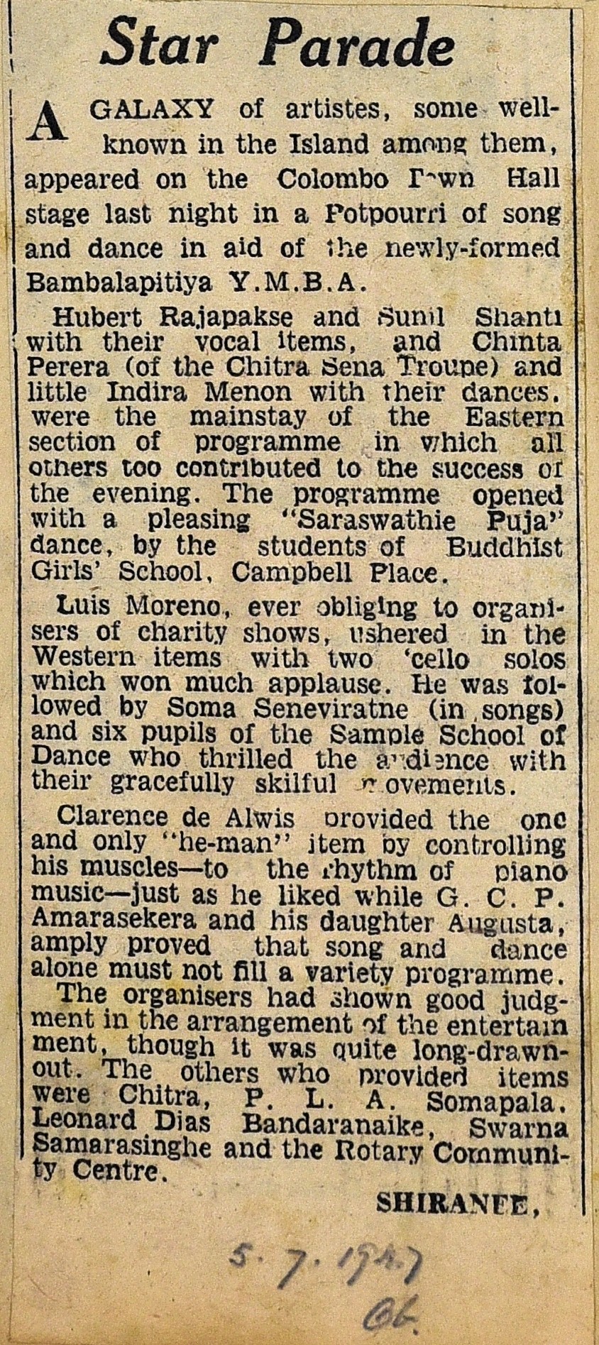 The organisers had shown good judgment in the arrangement of the entertainment, though it was quite long-drawn-out. The others who provided items were Chitra, P. L. A. Somapala. Leonard Dias Bandaranaike, Swarna Samarasinghe and the Rotary Community Centre.