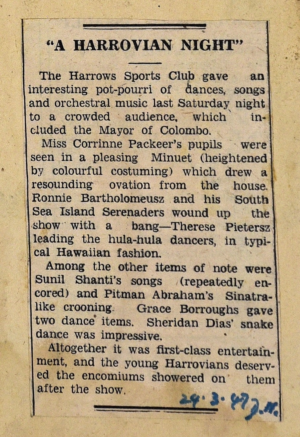 The Harrows Sports Club gave an interesting pot-pourri of dances, songs and orchestral music last Saturday night to a crowded audience, which in- cluded the Mayor of Colombo.
