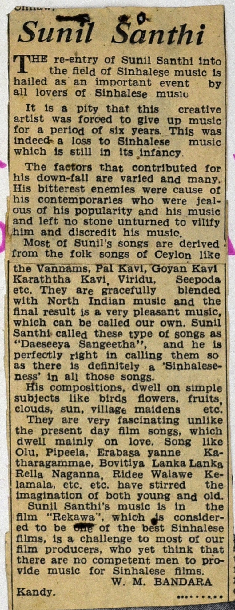 Sunil Santhi's music is in the film "Rekawa", which is considered to be one of the best Sinhalese films, is a challenge to most of our film producers, who yet think that there are no competent men to provide music for Sinhalese films.