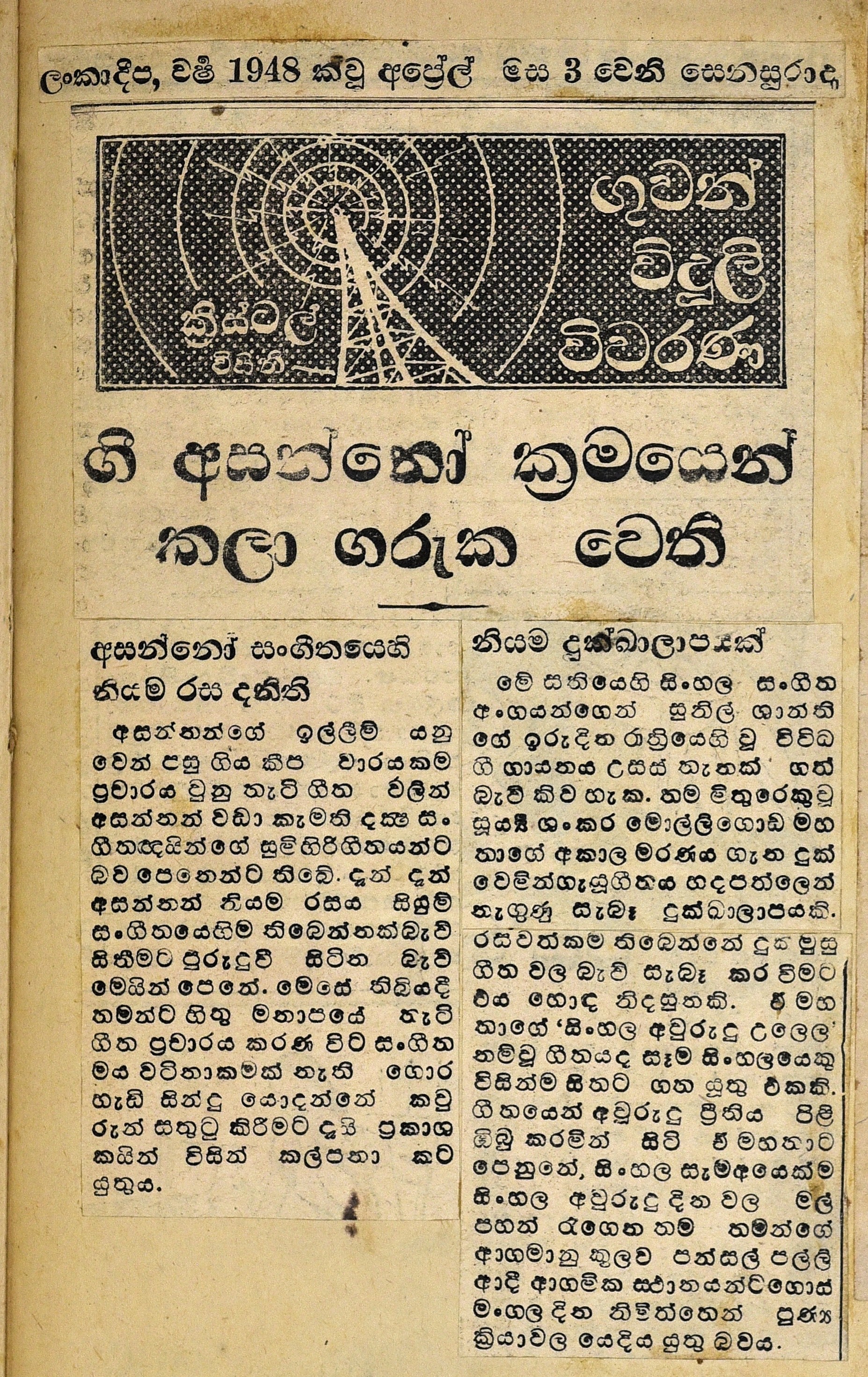 The broadcasts of Hindustani reords, relays of Indian stations for Hinustani music and Hindustani conerts of the Colombo Radio are regarded by the Sinhalese listener. musically, as an integral part of the Sinhalese programme.