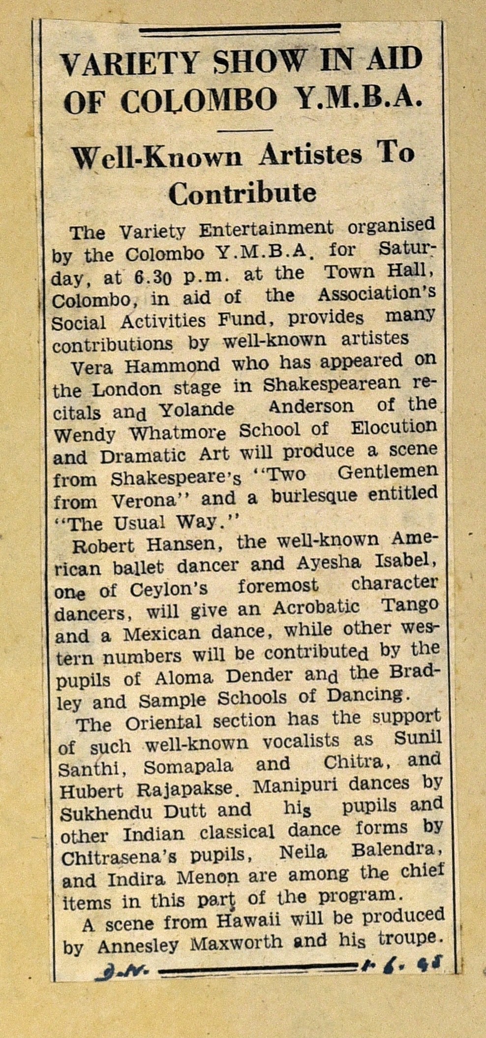 The Oriental section has the support of such well-known vocalists as Sunil Santhi, Somapala and Chitra, and Hubert Rajapakse. Manipuri dances by Sukhendu Dutt and his pupils and other Indian classical dance forms by Chitrasena's pupils, Neila Balendra, and Indira Menon are among the chief items in this part of the program.