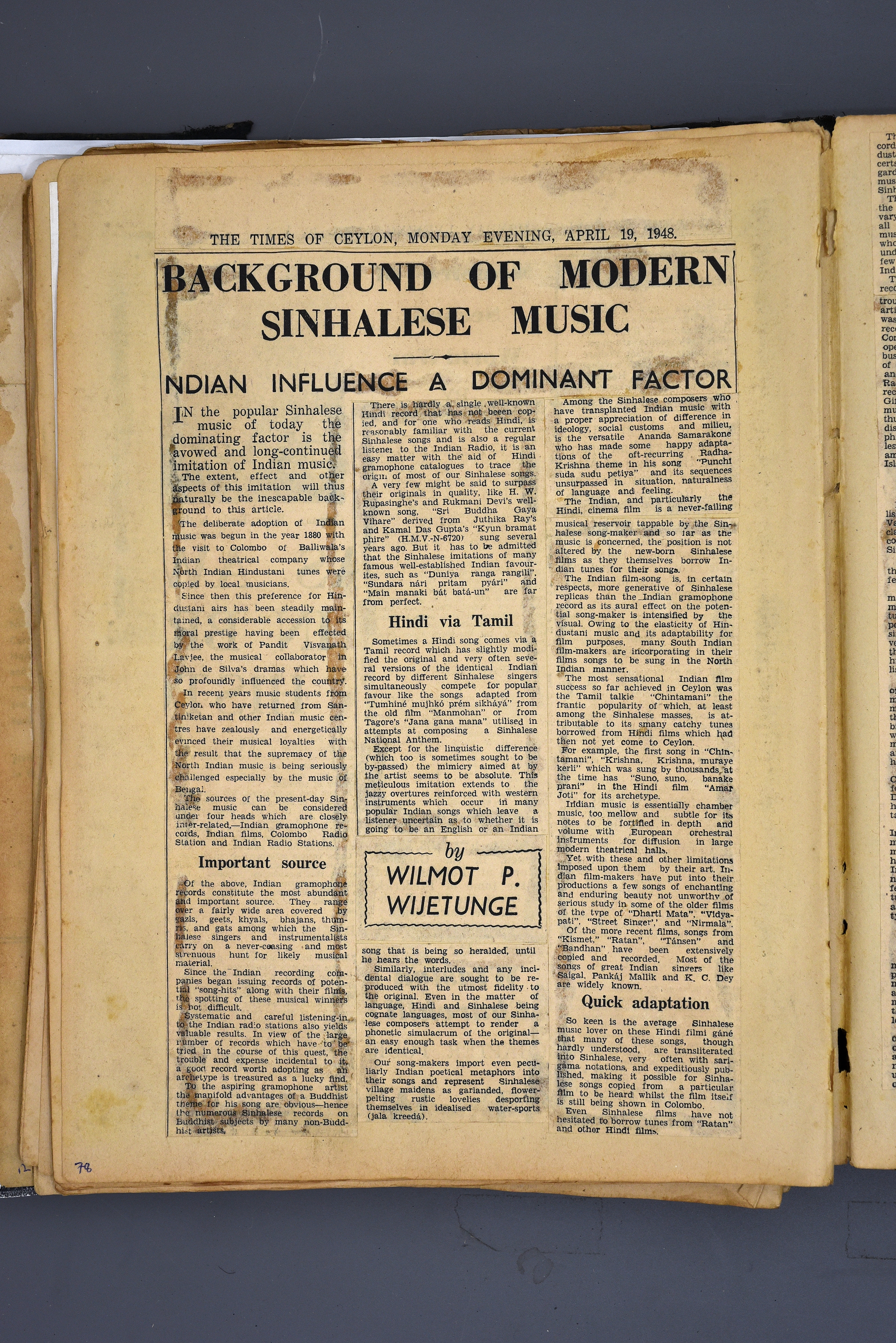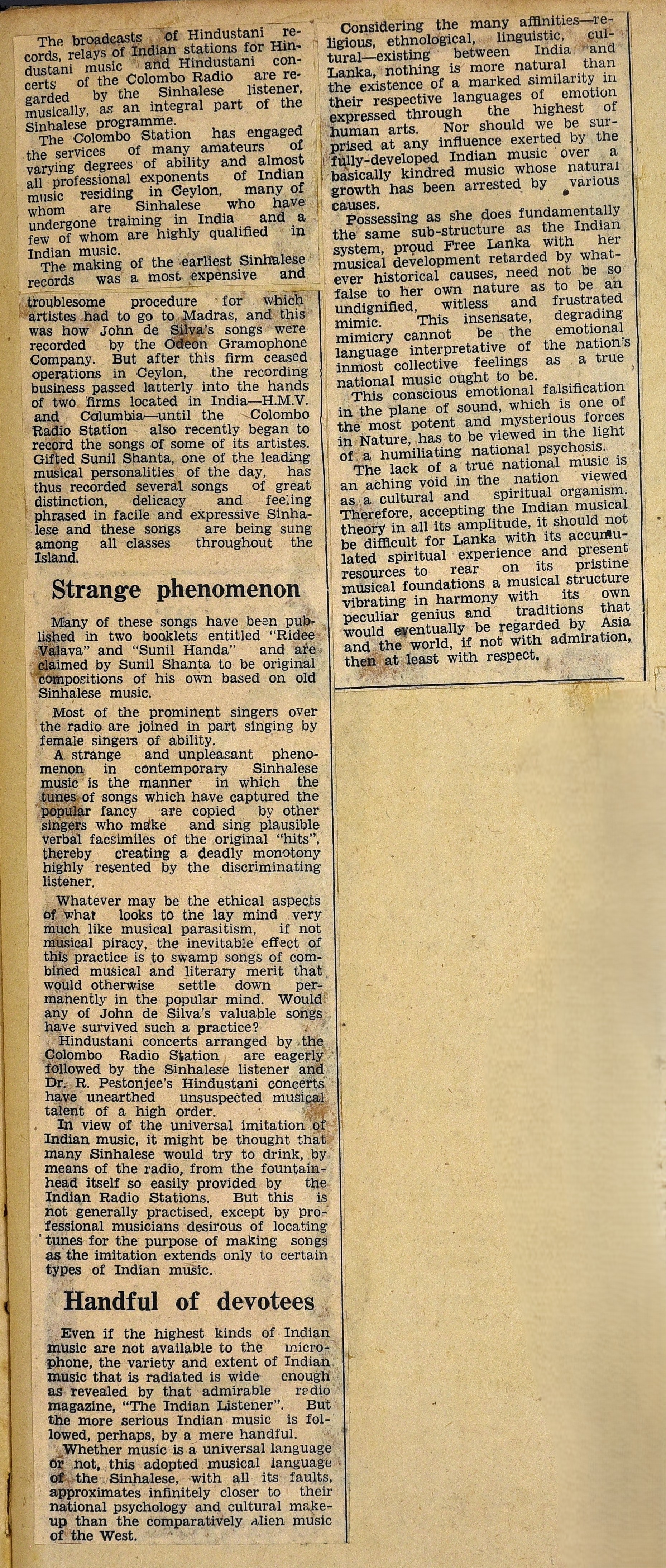 There is hardly a single well-known Hindi record that has not been copied, and for one who reads Hindi, is reasonably familiar with the current Sinhalese songs and is also a regular listener to the Indian Radio, it is an easy matter with the aid of Hindi gramophone catalogues to trace the origin of most of our Sinhalese songs.