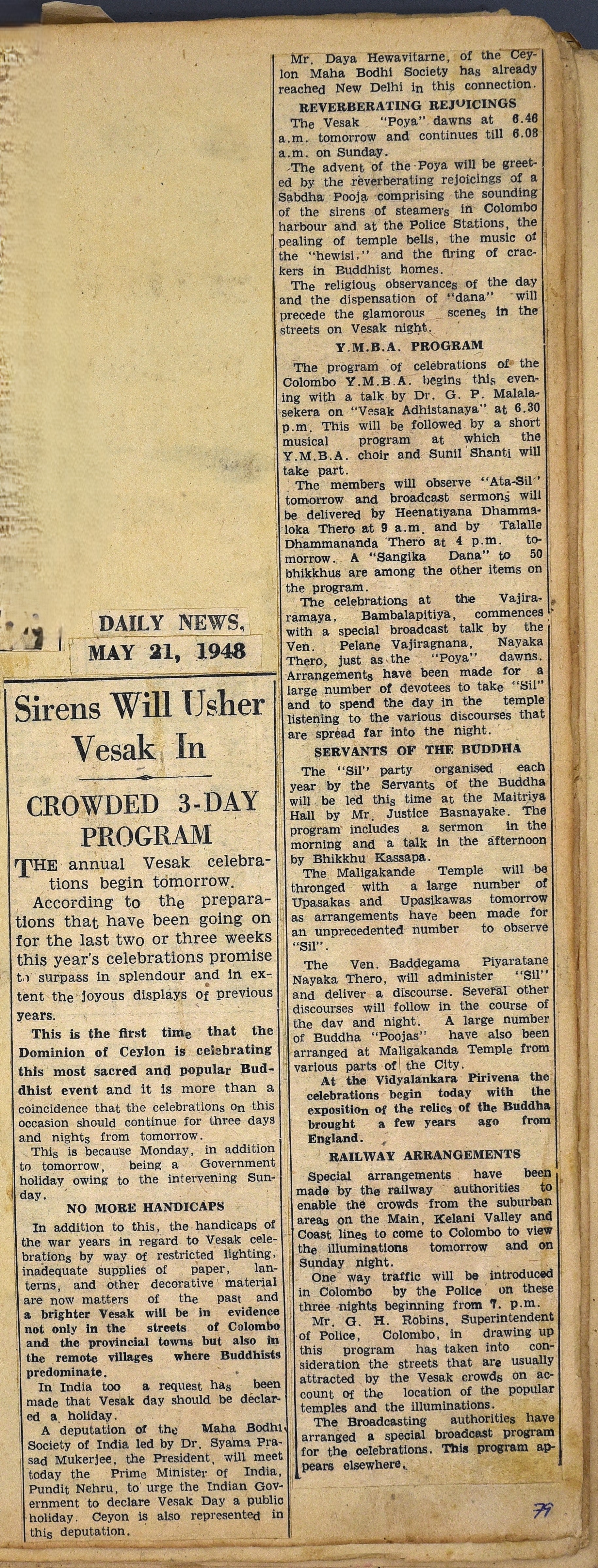 The advent of the Poya will be greeted by the reverberating rejoicings of a Sabdha Pooja comprising the sounding of the sirens of steamers in Colombo harbour and at the Police Stations, the pealing of temple bells, the music of the "hewisi," and the firing of cruckers in Buddhist homes.